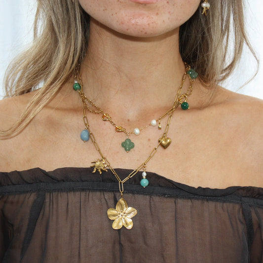 Handcrafted in 18k gold-plated stainless steel, freshwater pearls and natural stones, anchored by sculptural silhouettes, each piece invites quiet storytelling. Bespoke charms invite personalisation, balancing ease with boldness, worn close like fragments of memory, marking our moment in time. Anchored in fluidity and designed for everyday resonance, this capsule offers more than decoration—it’s a return to self, a kind of stillness you can feel.